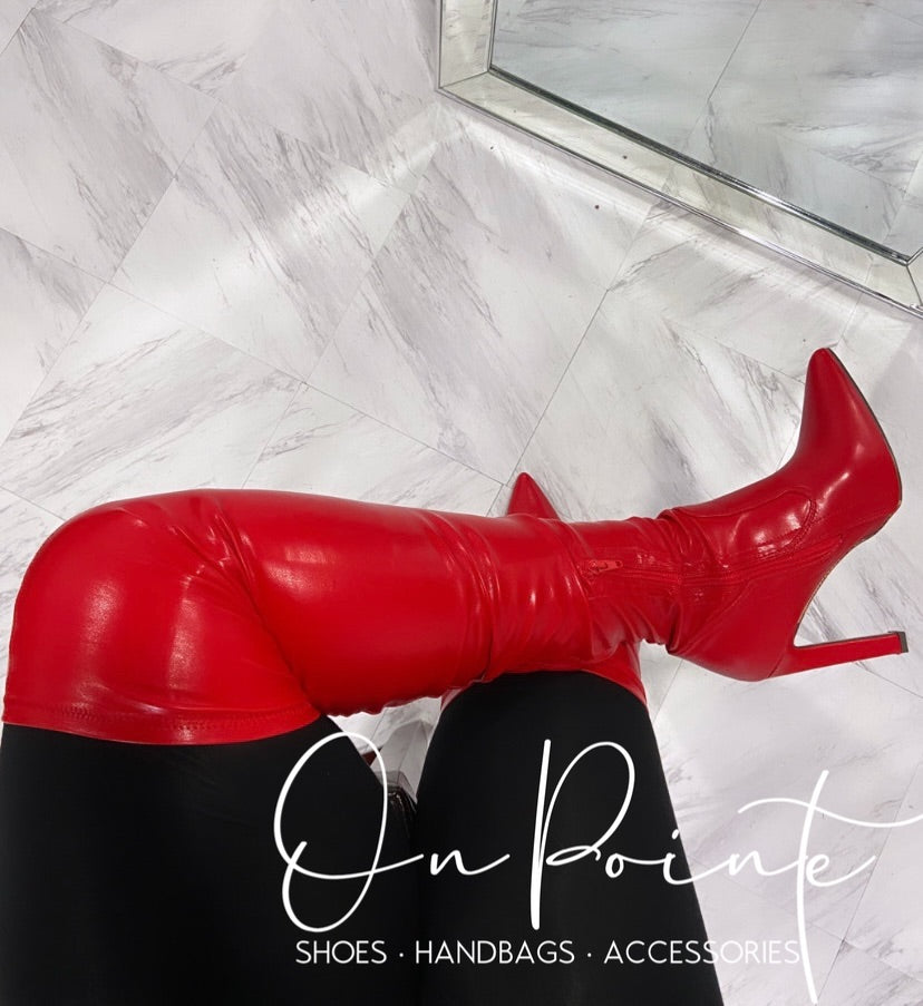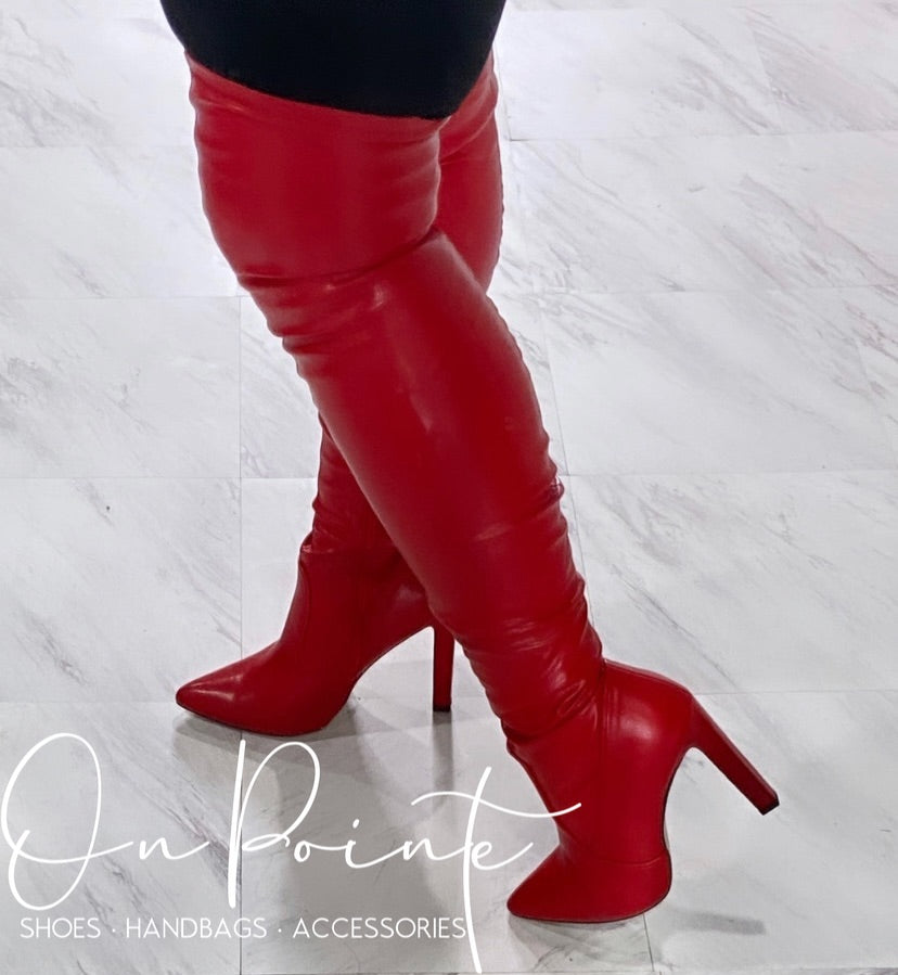 Murder she wrote. Kill any outfit with this red over the knee boot. “Assassin” is a crowd pleaser and a closet staple.
